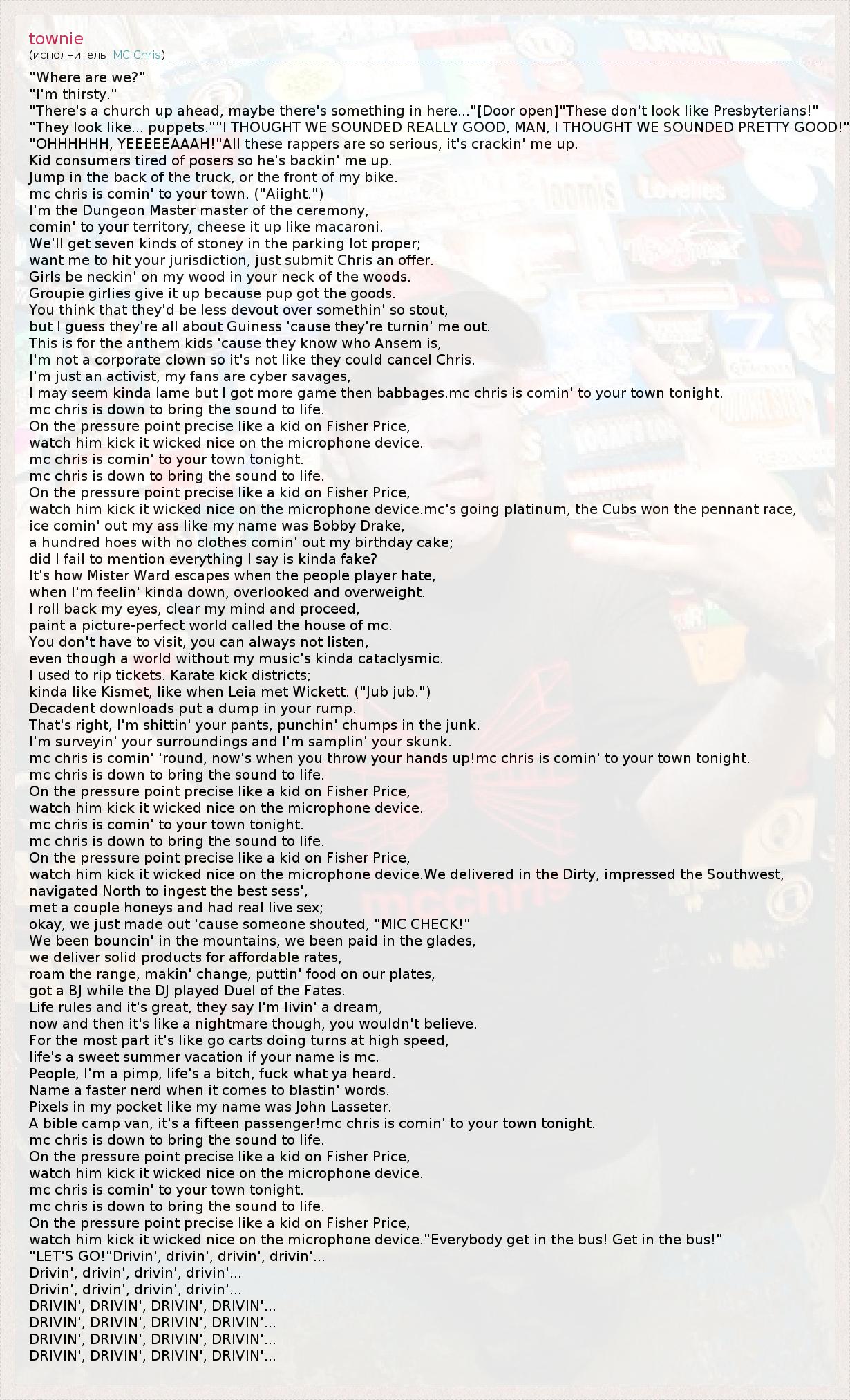 Это интересно:Кристофер Брендан Ворд IV, более известный как mc chris (заглавные буквы необязательны), рэпер и юморист-импровизатор родился 2 сентября, 1975, в Либертивилль, штат Иллинойс. Его отличительные черты - синтез таких образов как geek (на русский это примерно переводится как "ботаник, интересующийся компьютерами") и традиционного гангста имиджа, присущего многим хип-хоп исполнителям, а также высота... продолжение