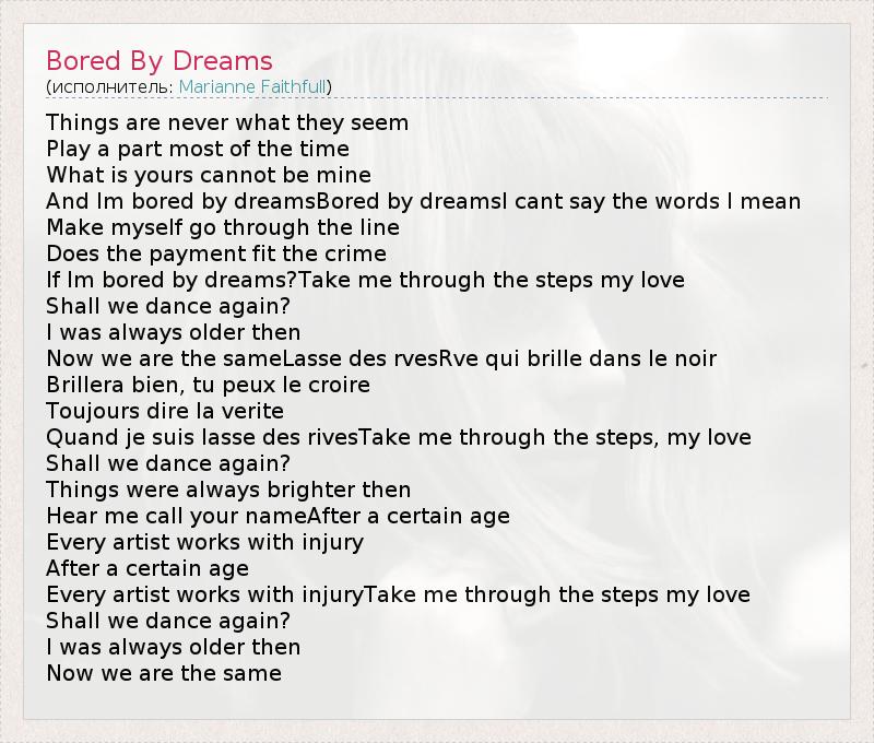 Things are never what they seem Play a part most of the time What is yours cannot be mine And Im bored by dreamsBored by dreamsI cant say the words I mean Make myself go through the line Does the payment fit the crime If Im bored by dreams?Take me through the steps my love Shall we dance again? I was always older then Now we are the sameLasse des rvesRve qui brille dans le noir Brillera bien, tu peux le croire Toujours dire la verite Quand je suis lasse des rivesTake me through the steps, my love Shall we dance again? Things were always brighter then Hear me call your nameAfter a certain age Every artist works with injury After a certain age Every artist works with injuryTake me through the steps my love Shall we dance again? I was always older then Now we are the same
