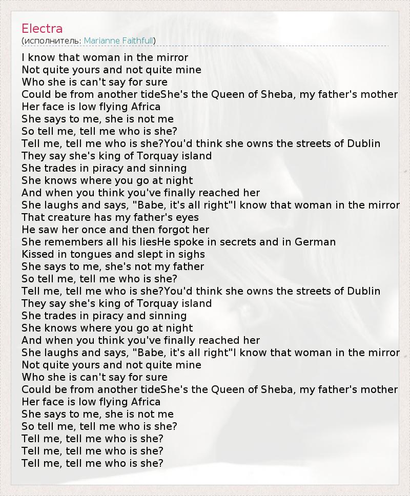 She laughs and says, "Babe, it's all right"I know that woman in the mirror