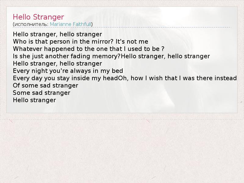 А как ты думаешь, о чем песня "Hello Stranger" ?