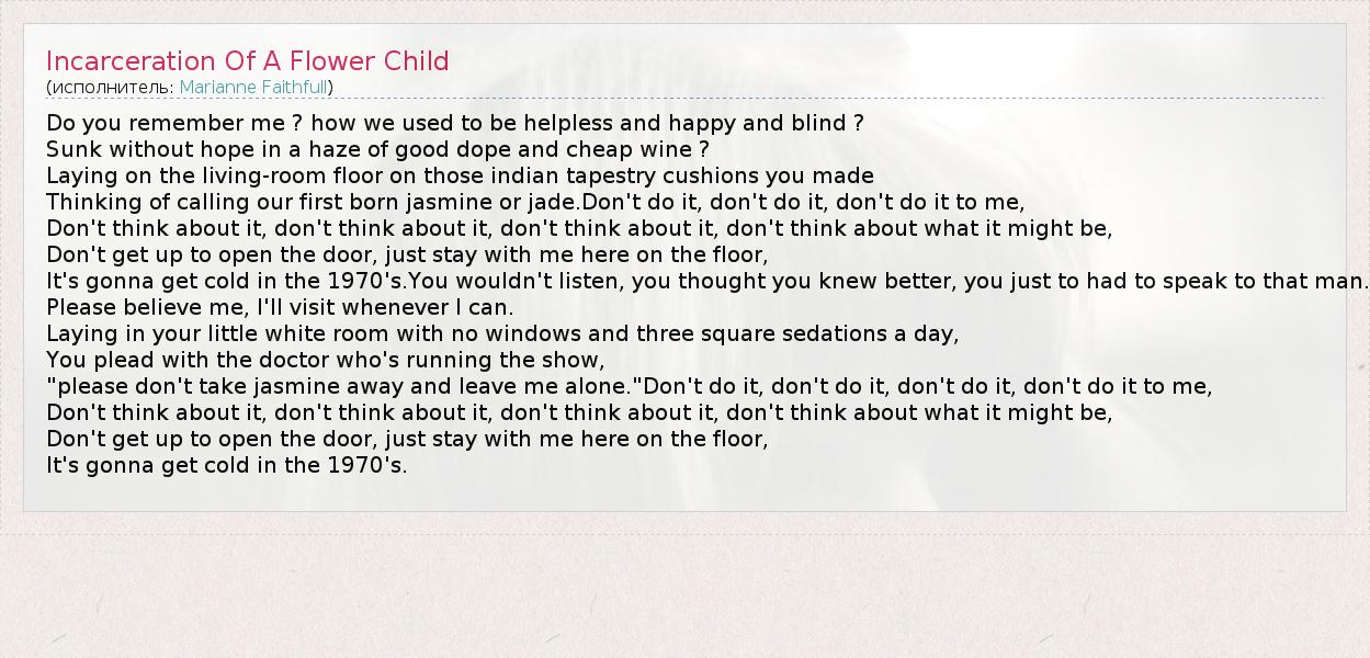 ГлавнаяИсполнителиMarianne FaithfullIncarceration Of A Flower Child