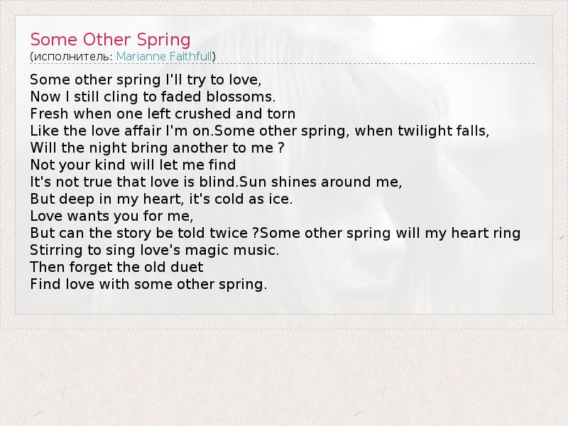 Some other spring I'll try to love, Now I still cling to faded blossoms. Fresh when one left crushed and torn Like the love affair I'm on.Some other spring, when twilight falls, Will the night bring another to me ? Not your kind will let me find It's not true that love is blind.Sun shines around me, But deep in my heart, it's cold as ice. Love wants you for me, But can the story be told twice ?Some other spring will my heart ring Stirring to sing love's magic music. Then forget the old duet Find love with some other spring.