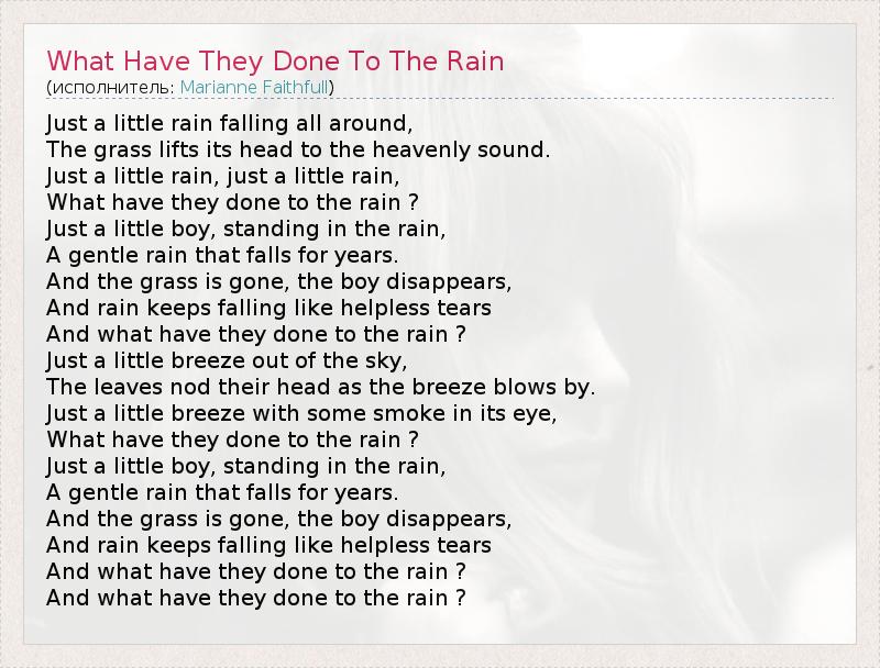 А как ты думаешь, о чем песня "What Have They Done To The Rain" ?