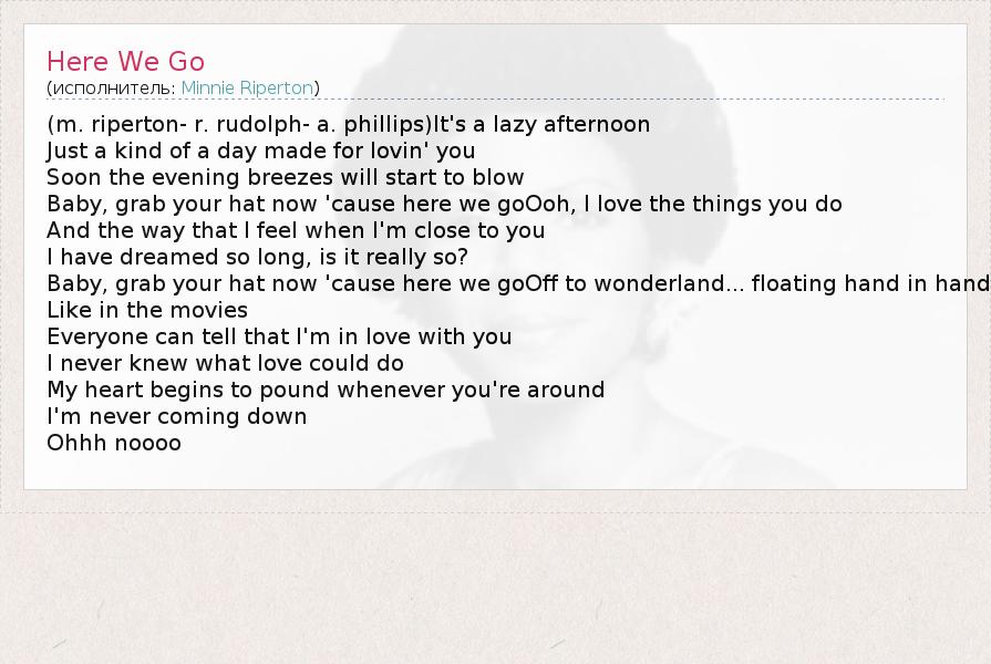 Это интересно:Minnie Julia Riperton (8 ноября 1947 - 12 июля 1979 года)-американская певица, прославившаяся в 1975 синглом "Loving you". Её вокальный диапазон насчитывает пять с половиной октав! В детстве Riperton обучалась музыке, драме, и танцам в Чикагском Линкольн-центре.В подростковом возрасте начала петь в Чикагской женской группе The Gems. Ее ранние связи с легендарной Chess-records предоставили ей возможность петь на бэк-вокале... продолжение