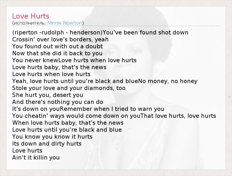 (riperton -rudolph - henderson)You've been found shot down Crossin' over love's borders, yeah You found out with out a doubt Now that she did it back to you You never knewLove hurts when love hurts Love hurts baby, that's the news Love hurts when love hurts Yeah, love hurts until you're black and blueNo money, no honey Stole your love and your diamonds, too She hurt you, desert you And there's nothing you can do It's down on youRemember when I tried to warn you You cheatin' ways would come down on youThat love hurts, love hurts When love hurts baby, that's the news Love hurts until you're black and blue You know you know it hurts Its down and dirty hurts Love hurts Ain't it killin you