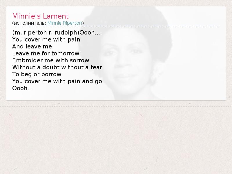 Это интересно:Minnie Julia Riperton (8 ноября 1947 - 12 июля 1979 года)-американская певица, прославившаяся в 1975 синглом "Loving you". Её вокальный диапазон насчитывает пять с половиной октав! В детстве Riperton обучалась музыке, драме, и танцам в Чикагском Линкольн-центре.В подростковом возрасте начала петь в Чикагской женской группе The Gems. Ее ранние связи с легендарной Chess-records предоставили ей возможность петь на бэк-вокале... продолжение