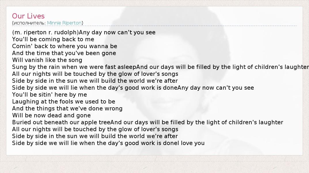 (m. riperton r. rudolph)Any day now can't you see You'll be coming back to me Comin' back to where you wanna be And the time that you've been gone Will vanish like the song Sung by the rain when we were fast asleepAnd our days will be filled by the light of children's laughter All our nights will be touched by the glow of lover's songs Side by side in the sun we will build the world we're after Side by side we will lie when the day's good work is doneAny day now can't you see You'll be sitin' here by me Laughing at the fools we used to be And the things that we've done wrong Will be now dead and gone Buried out beneath our apple treeAnd our days will be filled by the light of children's laughter All our nights will be touched by the glow of lover's songs Side by side in the sun we will build the world we're after Side by side we will lie when the day's good work is doneI love you