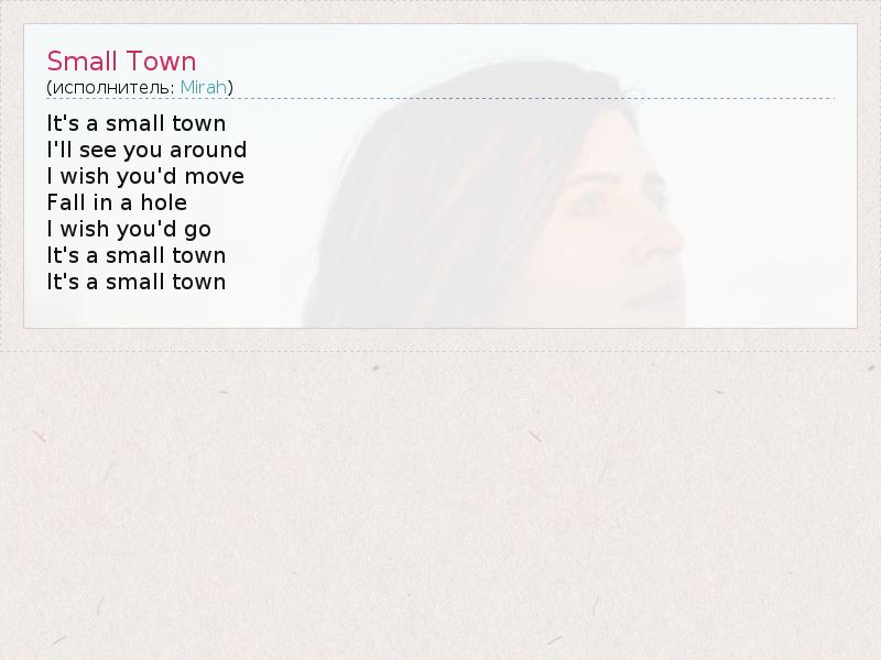 It's a small town I'll see you around I wish you'd move Fall in a hole I wish you'd go It's a small town It's a small town