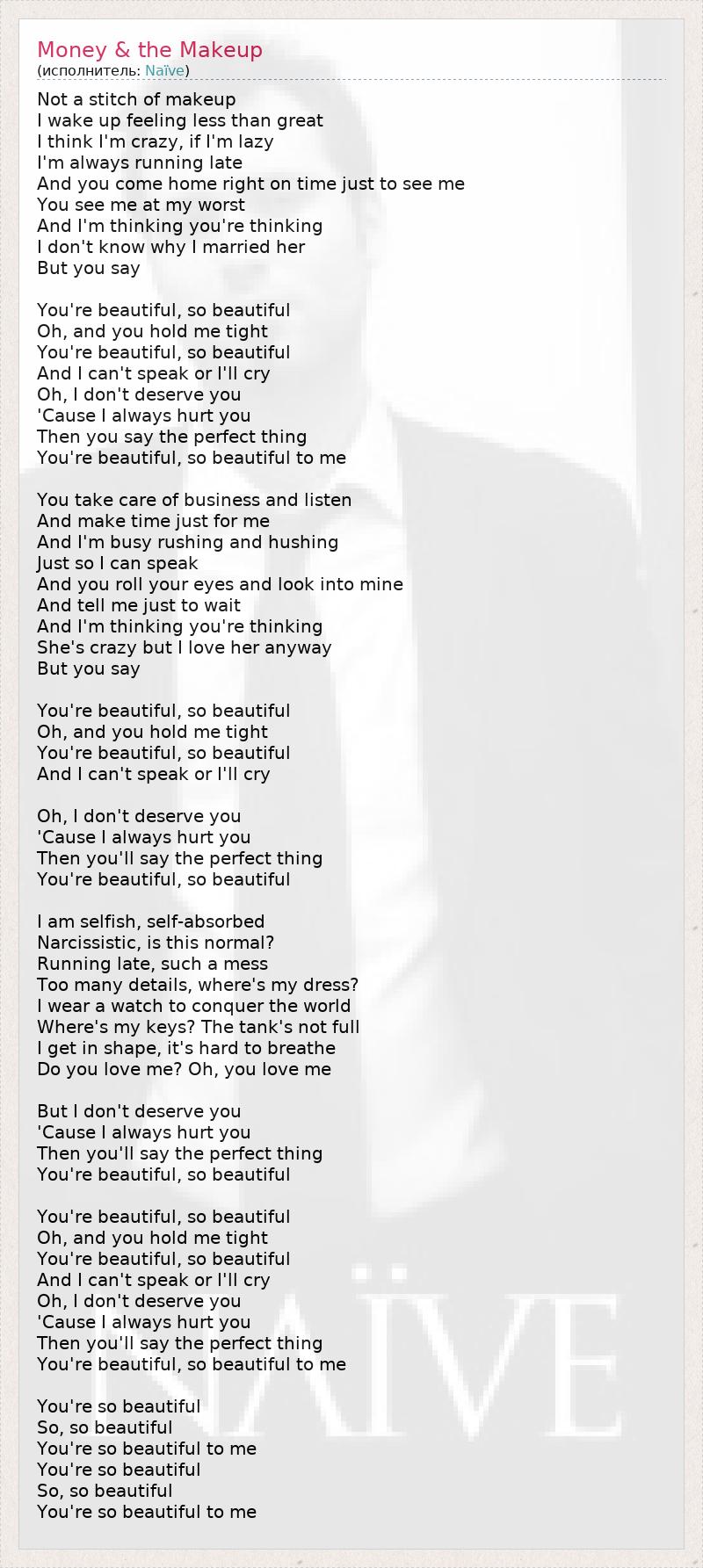Ни грамма косметики. Я просыпаюсь, чувствуя себя неважно. Мне кажется, я схожу с ума; когда я ленюсь, Я всё время опаздываю. А ты приходишь домой вовремя, просто чтобы увидеть меня. Ты видел меня в самом неприглядном свете, И мне кажется, ты думаешь: "И зачем я только на ней женился?!" Но ты говоришь: Ты прекрасна, ты так прекрасна! О, и ты крепко меня обнимаешь. Ты прекрасна, ты так прекрасна! И я не могу говорить, иначе заплачу. О, я не заслуживаю тебя, Ведь я всегда причиняю тебе боль, А ты говоришь идеальные слова: Ты прекрасна, ты так прекрасна для меня! Тебе интересны мои дела, ты слушаешь, Уделяешь мне время, А я вечно бегаю занятая, По крайней мере, так я говорю. А ты закатываешь глаза, смотришь на меня И говоришь: подожди минутку. И мне кажется, ты думаешь: "Она сумасшедшая, но я всё равно её люблю", Но ты говоришь: Ты прекрасна, ты так прекрасна! О, и ты крепко меня обнимаешь. Ты прекрасна, ты так прекрасна! И я не могу говорить, иначе заплачу. О, я не заслуживаю тебя, Ведь я всегда причиняю тебе боль, А ты говоришь идеальные слова: Ты прекрасна, ты так прекрасна! Я эгоистка, думающая только о себе, Самовлюблённая, разве это нормально? Поздно прихожу домой, такая растяпа! Слишком много аксессуаров, а где моё платье? Я надеваю часы, чтобы завоевать весь мир. Где мои ключи? Бак ещё не полон. Я вхожу в форму, тяжело дышать... Ты любишь меня? О, ты любишь меня. Но я не заслуживаю тебя, Ведь я всегда причиняю тебе боль, А ты говоришь идеальные слова: Ты прекрасна, ты так прекрасна! Ты прекрасна, ты так прекрасна! О, и ты крепко меня обнимаешь. Ты прекрасна, ты так прекрасна! И я не могу говорить, иначе заплачу. О, я не заслуживаю тебя, Ведь я всегда причиняю тебе боль, А ты говоришь идеальные слова: Ты прекрасна, ты так прекрасна для меня! Ты так прекрасна, Так прекрасна, Ты так прекрасна для меня! Ты так прекрасна, Так прекрасна, Ты так прекрасна для меня!