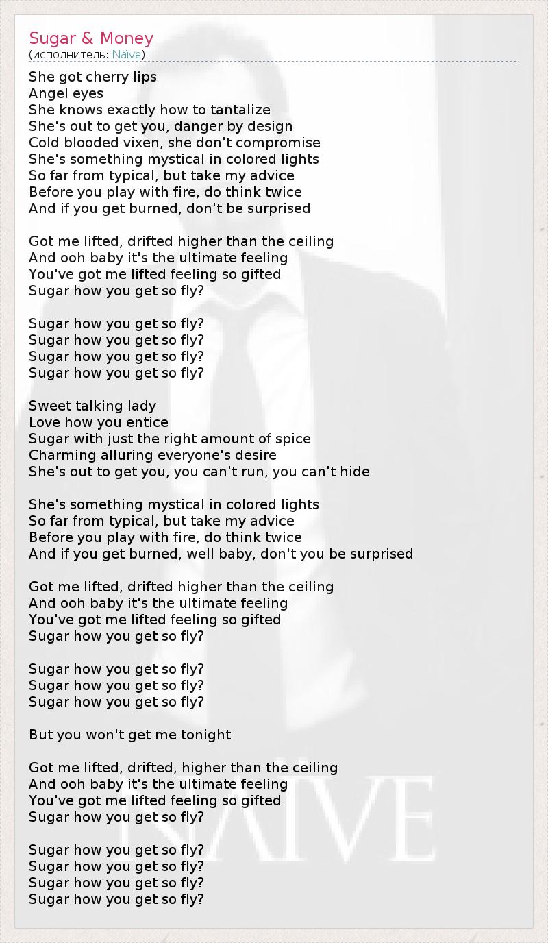 She got cherry lips Angel eyes She knows exactly how to tantalize She's out to get you, danger by design Cold blooded vixen, she don't compromise She's something mystical in colored lights So far from typical, but take my advice Before you play with fire, do think twice And if you get burned, don't be surprised Got me lifted, drifted higher than the ceiling And ooh baby it's the ultimate feeling You've got me lifted feeling so gifted Sugar how you get so fly? Sugar how you get so fly? Sugar how you get so fly? Sugar how you get so fly? Sugar how you get so fly? Sweet talking lady Love how you entice Sugar with just the right amount of spice Charming alluring everyone's desire She's out to get you, you can't run, you can't hide She's something mystical in colored lights So far from typical, but take my advice Before you play with fire, do think twice And if you get burned, well baby, don't you be surprised Got me lifted, drifted higher than the ceiling And ooh baby it's the ultimate feeling You've got me lifted feeling so gifted Sugar how you get so fly? Sugar how you get so fly? Sugar how you get so fly? Sugar how you get so fly? But you won't get me tonight Got me lifted, drifted, higher than the ceiling And ooh baby it's the ultimate feeling You've got me lifted feeling so gifted Sugar how you get so fly? Sugar how you get so fly? Sugar how you get so fly? Sugar how you get so fly? Sugar how you get so fly?