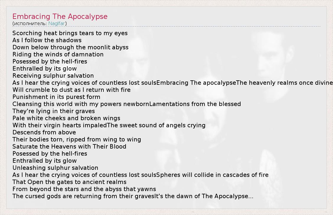 А как ты думаешь, о чем песня "Embracing The Apocalypse" ?