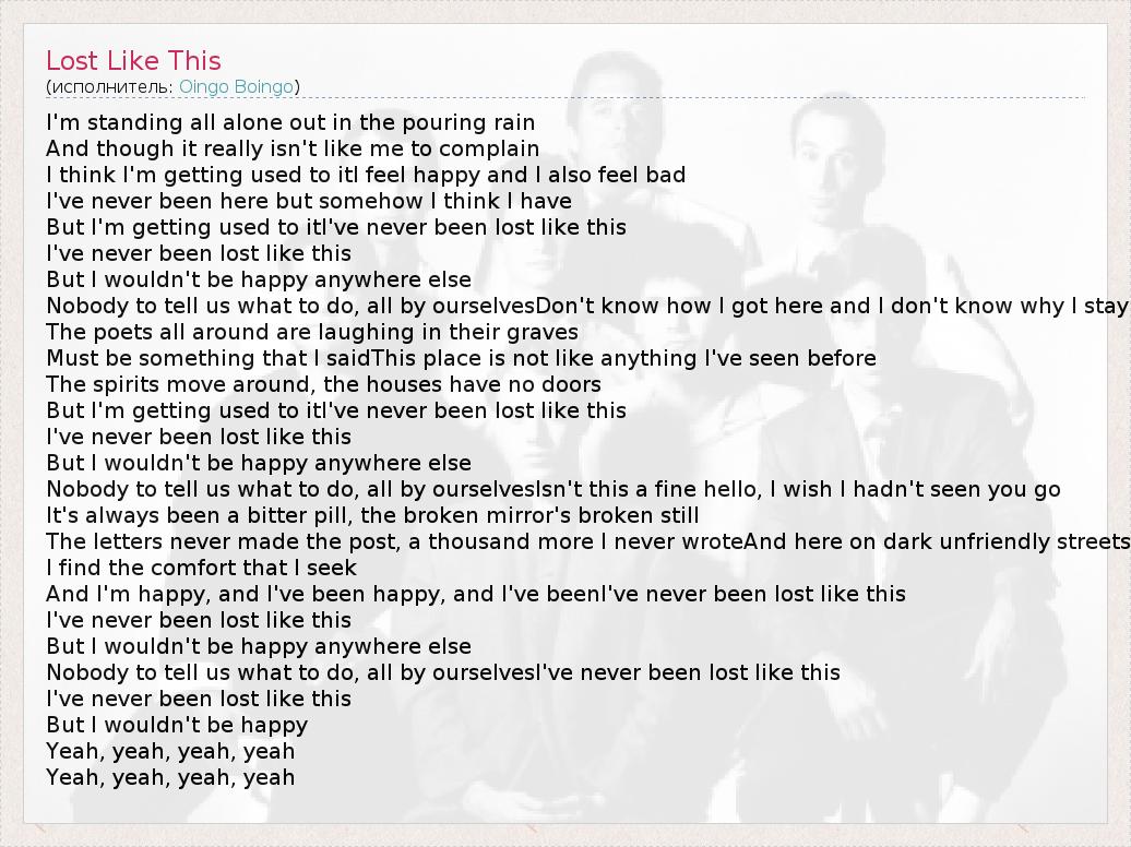 I'm standing all alone out in the pouring rain And though it really isn't like me to complain I think I'm getting used to itI feel happy and I also feel bad I've never been here but somehow I think I have But I'm getting used to itI've never been lost like this I've never been lost like this But I wouldn't be happy anywhere else Nobody to tell us what to do, all by ourselvesDon't know how I got here and I don't know why I stay The poets all around are laughing in their graves Must be something that I saidThis place is not like anything I've seen before The spirits move around, the houses have no doors But I'm getting used to itI've never been lost like this I've never been lost like this But I wouldn't be happy anywhere else Nobody to tell us what to do, all by ourselvesIsn't this a fine hello, I wish I hadn't seen you go It's always been a bitter pill, the broken mirror's broken still The letters never made the post, a thousand more I never wroteAnd here on dark unfriendly streets I find the comfort that I seek And I'm happy, and I've been happy, and I've beenI've never been lost like this I've never been lost like this But I wouldn't be happy anywhere else Nobody to tell us what to do, all by ourselvesI've never been lost like this I've never been lost like this But I wouldn't be happy Yeah, yeah, yeah, yeah Yeah, yeah, yeah, yeah