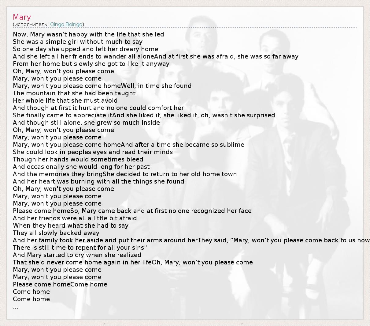 That she'd never come home again in her lifeOh, Mary, won't you please come