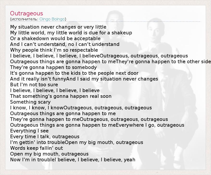 I believe, I believe, I believe, I believeOutrageous, outrageous, outrageous