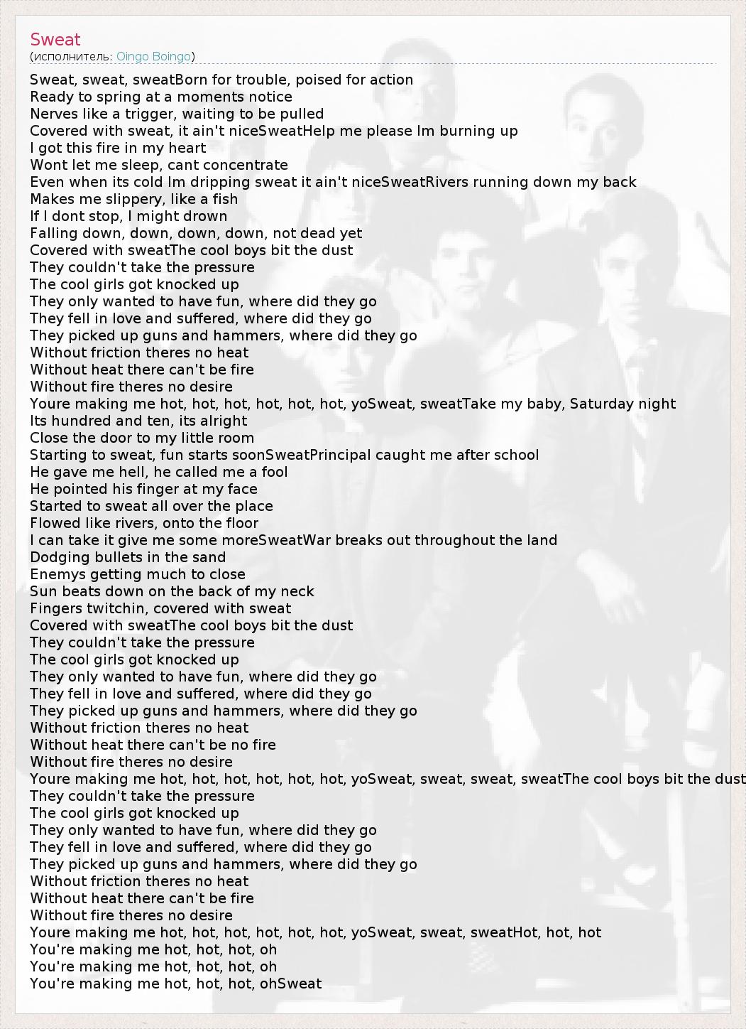 Sweat, sweat, sweatBorn for trouble, poised for action Ready to spring at a moments notice Nerves like a trigger, waiting to be pulled Covered with sweat, it ain't niceSweatHelp me please Im burning up I got this fire in my heart Wont let me sleep, cant concentrate Even when its cold Im dripping sweat it ain't niceSweatRivers running down my back Makes me slippery, like a fish If I dont stop, I might drown Falling down, down, down, down, not dead yet Covered with sweatThe cool boys bit the dust They couldn't take the pressure The cool girls got knocked up They only wanted to have fun, where did they go They fell in love and suffered, where did they go They picked up guns and hammers, where did they go Without friction theres no heat Without heat there can't be fire Without fire theres no desire Youre making me hot, hot, hot, hot, hot, hot, yoSweat, sweatTake my baby, Saturday night Its hundred and ten, its alright Close the door to my little room Starting to sweat, fun starts soonSweatPrincipal caught me after school He gave me hell, he called me a fool He pointed his finger at my face Started to sweat all over the place Flowed like rivers, onto the floor I can take it give me some moreSweatWar breaks out throughout the land Dodging bullets in the sand Enemys getting much to close Sun beats down on the back of my neck Fingers twitchin, covered with sweat Covered with sweatThe cool boys bit the dust They couldn't take the pressure The cool girls got knocked up They only wanted to have fun, where did they go They fell in love and suffered, where did they go They picked up guns and hammers, where did they go Without friction theres no heat Without heat there can't be no fire Without fire theres no desire Youre making me hot, hot, hot, hot, hot, hot, yoSweat, sweat, sweat, sweatThe cool boys bit the dust They couldn't take the pressure The cool girls got knocked up They only wanted to have fun, where did they go They fell in love and suffered, where did they go They picked up guns and hammers, where did they go Without friction theres no heat Without heat there can't be fire Without fire theres no desire Youre making me hot, hot, hot, hot, hot, hot, yoSweat, sweat, sweatHot, hot, hot You're making me hot, hot, hot, oh You're making me hot, hot, hot, oh You're making me hot, hot, hot, ohSweat