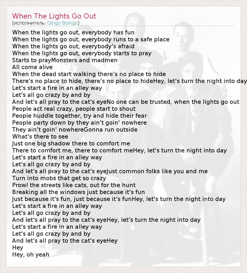 When the lights go out, everybody has fun When the lights go out, everybody runs to a safe place When the lights go out, everybody's afraid When the lights go out, everybody starts to pray Starts to prayMonsters and madmen All come alive When the dead start walking there's no place to hide There's no place to hide, there's no place to hideHey, let's turn the night into day Let's start a fire in an alley way Let's all go crazy by and by And let's all pray to the cat's eyeNo one can be trusted, when the lights go out People act real crazy, people start to shout People huddle together, try and hide their fear People party down by they ain't goin' nowhere They ain't goin' nowhereGonna run outside What's there to see Just one big shadow there to comfort me There to comfort me, there to comfort meHey, let's turn the night into day Let's start a fire in an alley way Let's all go crazy by and by And let's all pray to the cat's eyeJust common folks like you and me Turn into mobs that get so crazy Prowl the streets like cats, out for the hunt Breaking all the windows just because it's fun Just because it's fun, just because it's funHey, let's turn the night into day Let's start a fire in an alley way Let's all go crazy by and by And let's all pray to the cat's eyeHey, let's turn the night into day Let's start a fire in an alley way Let's all go crazy by and by And let's all pray to the cat's eyeHey Hey Hey, oh yeah