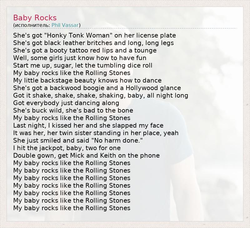 She's got "Honky Tonk Woman" on her license plate She's got black leather britches and long, long legs She's got a booty tattoo red lips and a tounge Well, some girls just know how to have fun Start me up, sugar, let the tumbling dice roll My baby rocks like the Rolling Stones My little backstage beauty knows how to dance She's got a backwood boogie and a Hollywood glance Got it shake, shake, shake, shaking, baby, all night long Got everybody just dancing along She's buck wild, she's bad to the bone My baby rocks like the Rolling Stones Last night, I kissed her and she slapped my face It was her, her twin sister standing in her place, yeah She just smiled and said "No harm done." I hit the jackpot, baby, two for one Double gown, get Mick and Keith on the phone My baby rocks like the Rolling Stones My baby rocks like the Rolling Stones My baby rocks like the Rolling Stones My baby rocks like the Rolling Stones My baby rocks like the Rolling Stones My baby rocks like the Rolling Stones My baby rocks like the Rolling Stones