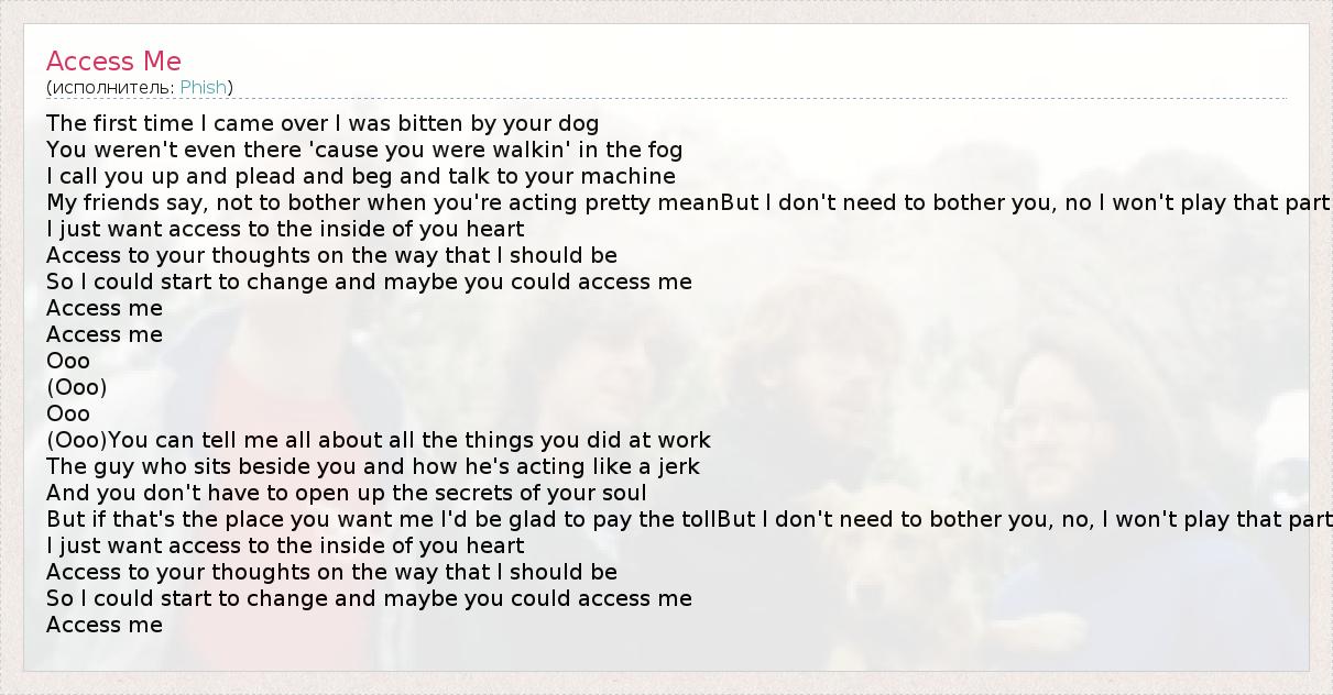 Это интересно:Phish — американская рок-группа, примечательная своими джем-сейшнами, импровизациями и постмодернистским смешением жанров. Phish была образована в 1983 году в университете Вермонта. Четыре ее участника выступали вместе 21 год, пока не распались в августе 2004 года. Их музыка содержала в себе элементы широкoго спектра жанров, и каждый их концерт был оригинальным в плане исполнения песен, порядка... продолжение