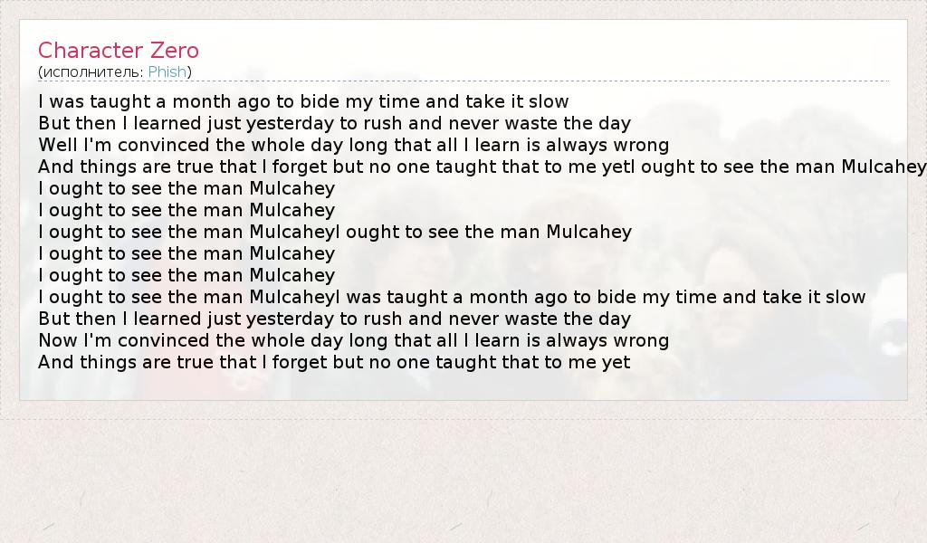 Это интересно:Phish — американская рок-группа, примечательная своими джем-сейшнами, импровизациями и постмодернистским смешением жанров. Phish была образована в 1983 году в университете Вермонта. Четыре ее участника выступали вместе 21 год, пока не распались в августе 2004 года. Их музыка содержала в себе элементы широкoго спектра жанров, и каждый их концерт был оригинальным в плане исполнения песен, порядка... продолжение