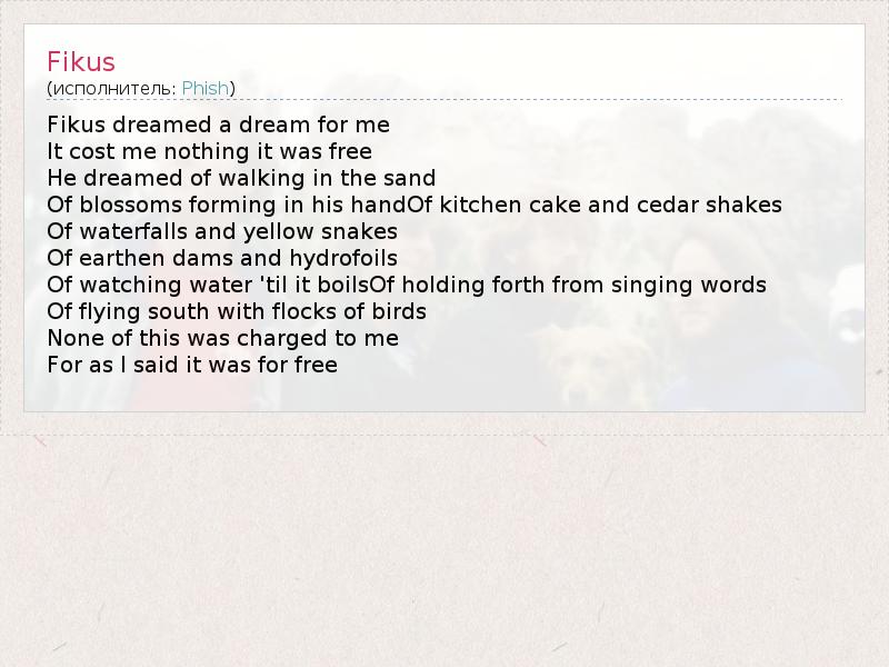 Это интересно:Phish — американская рок-группа, примечательная своими джем-сейшнами, импровизациями и постмодернистским смешением жанров. Phish была образована в 1983 году в университете Вермонта. Четыре ее участника выступали вместе 21 год, пока не распались в августе 2004 года. Их музыка содержала в себе элементы широкoго спектра жанров, и каждый их концерт был оригинальным в плане исполнения песен, порядка... продолжение