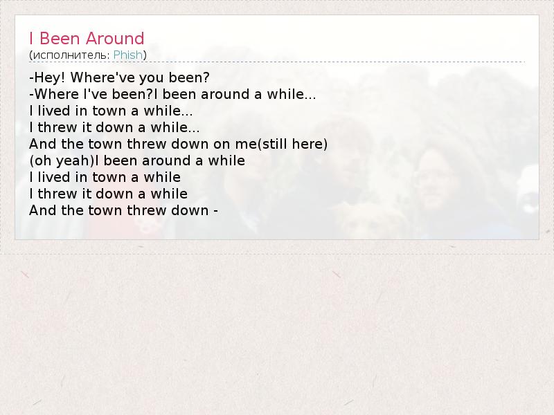 Это интересно:Phish — американская рок-группа, примечательная своими джем-сейшнами, импровизациями и постмодернистским смешением жанров. Phish была образована в 1983 году в университете Вермонта. Четыре ее участника выступали вместе 21 год, пока не распались в августе 2004 года. Их музыка содержала в себе элементы широкoго спектра жанров, и каждый их концерт был оригинальным в плане исполнения песен, порядка... продолжение