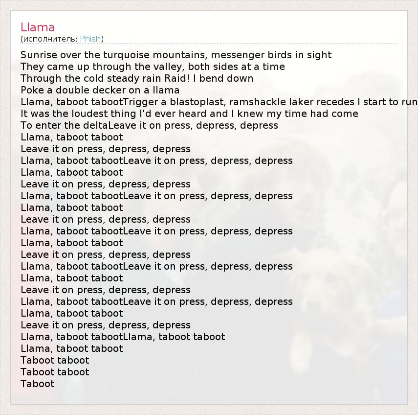 Llama, taboot tabootTrigger a blastoplast, ramshackle laker recedes I start to run
