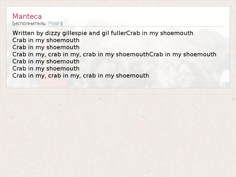 Crab in my, crab in my, crab in my shoemouthCrab in my shoemouth