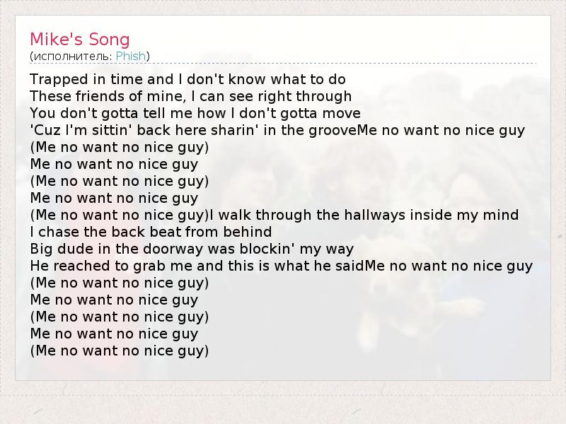 Trapped in time and I don't know what to do These friends of mine, I can see right through You don't gotta tell me how I don't gotta move 'Cuz I'm sittin' back here sharin' in the grooveMe no want no nice guy (Me no want no nice guy) Me no want no nice guy (Me no want no nice guy) Me no want no nice guy (Me no want no nice guy)I walk through the hallways inside my mind I chase the back beat from behind Big dude in the doorway was blockin' my way He reached to grab me and this is what he saidMe no want no nice guy (Me no want no nice guy) Me no want no nice guy (Me no want no nice guy) Me no want no nice guy (Me no want no nice guy)