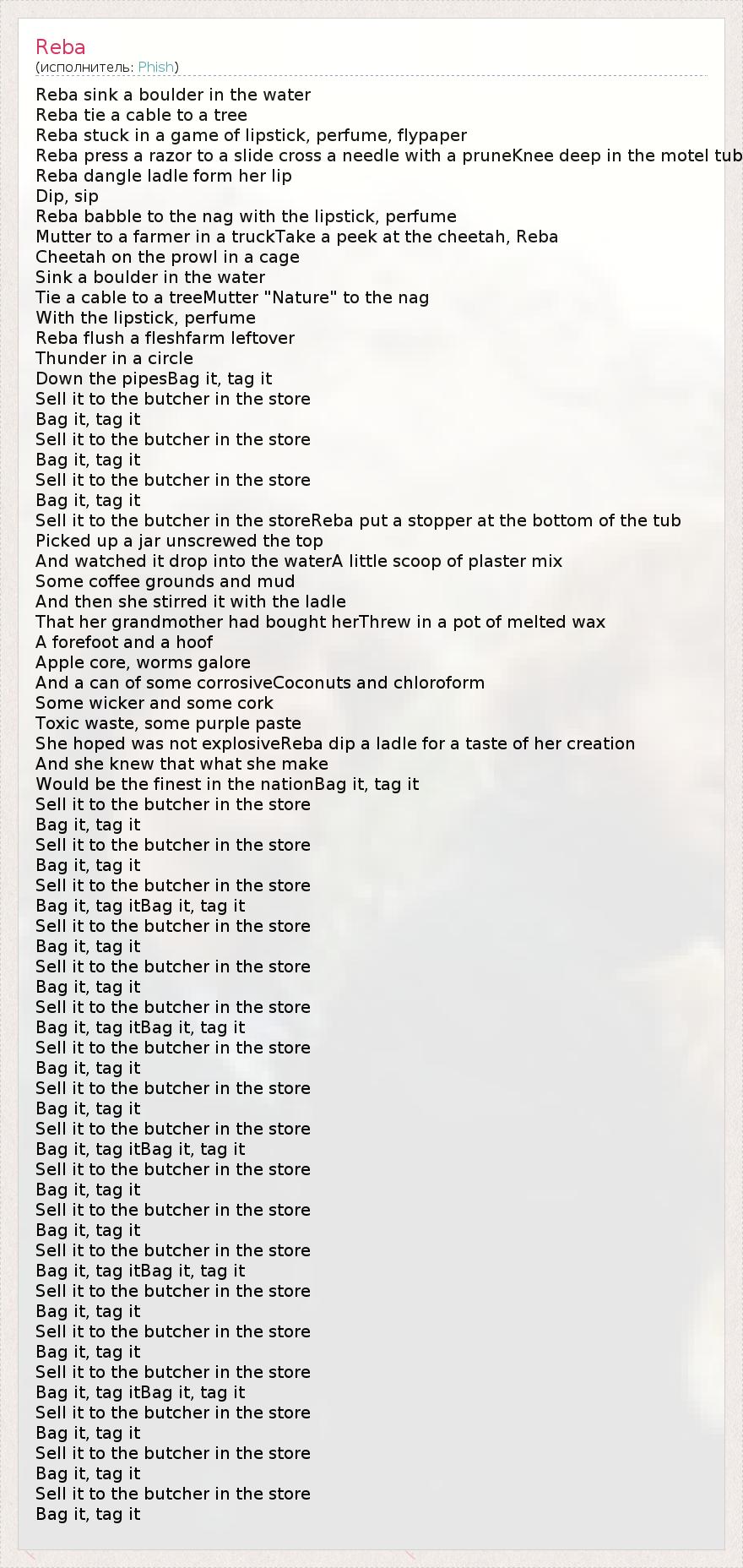 Reba press a razor to a slide cross a needle with a pruneKnee deep in the motel tub
