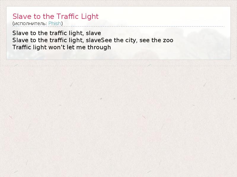 Slave to the traffic light, slave Slave to the traffic light, slaveSee the city, see the zoo Traffic light won't let me through