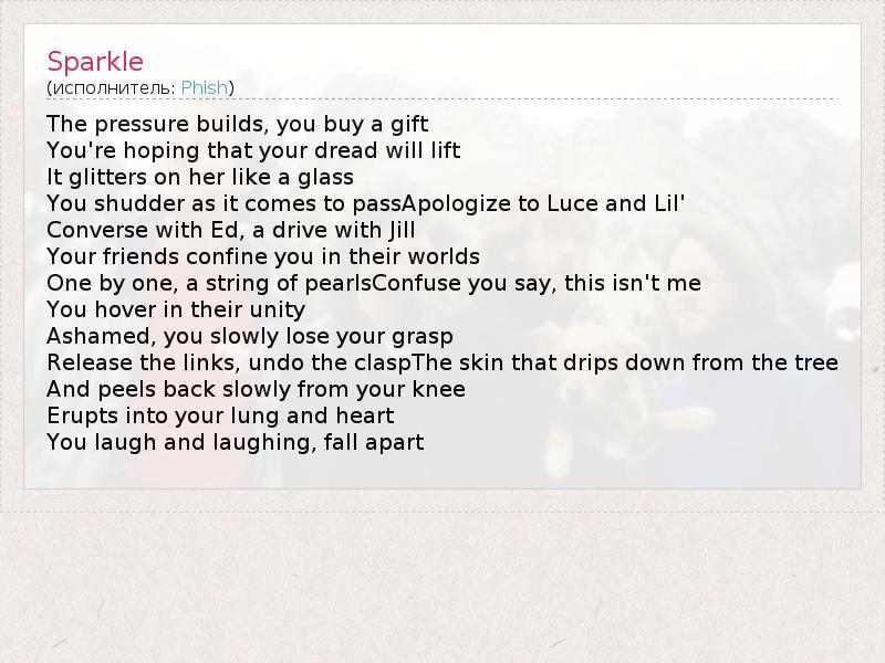 Это интересно:Phish — американская рок-группа, примечательная своими джем-сейшнами, импровизациями и постмодернистским смешением жанров. Phish была образована в 1983 году в университете Вермонта. Четыре ее участника выступали вместе 21 год, пока не распались в августе 2004 года. Их музыка содержала в себе элементы широкoго спектра жанров, и каждый их концерт был оригинальным в плане исполнения песен, порядка... продолжение