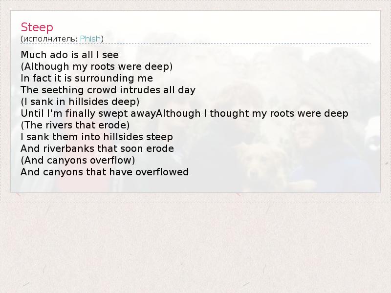 Это интересно:Phish — американская рок-группа, примечательная своими джем-сейшнами, импровизациями и постмодернистским смешением жанров. Phish была образована в 1983 году в университете Вермонта. Четыре ее участника выступали вместе 21 год, пока не распались в августе 2004 года. Их музыка содержала в себе элементы широкoго спектра жанров, и каждый их концерт был оригинальным в плане исполнения песен, порядка... продолжение