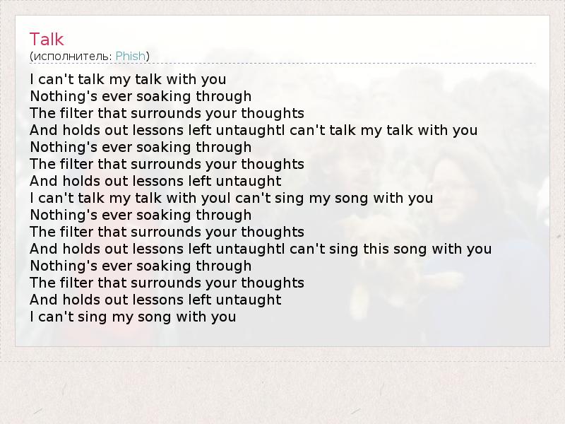 Это интересно:Phish — американская рок-группа, примечательная своими джем-сейшнами, импровизациями и постмодернистским смешением жанров. Phish была образована в 1983 году в университете Вермонта. Четыре ее участника выступали вместе 21 год, пока не распались в августе 2004 года. Их музыка содержала в себе элементы широкoго спектра жанров, и каждый их концерт был оригинальным в плане исполнения песен, порядка... продолжение
