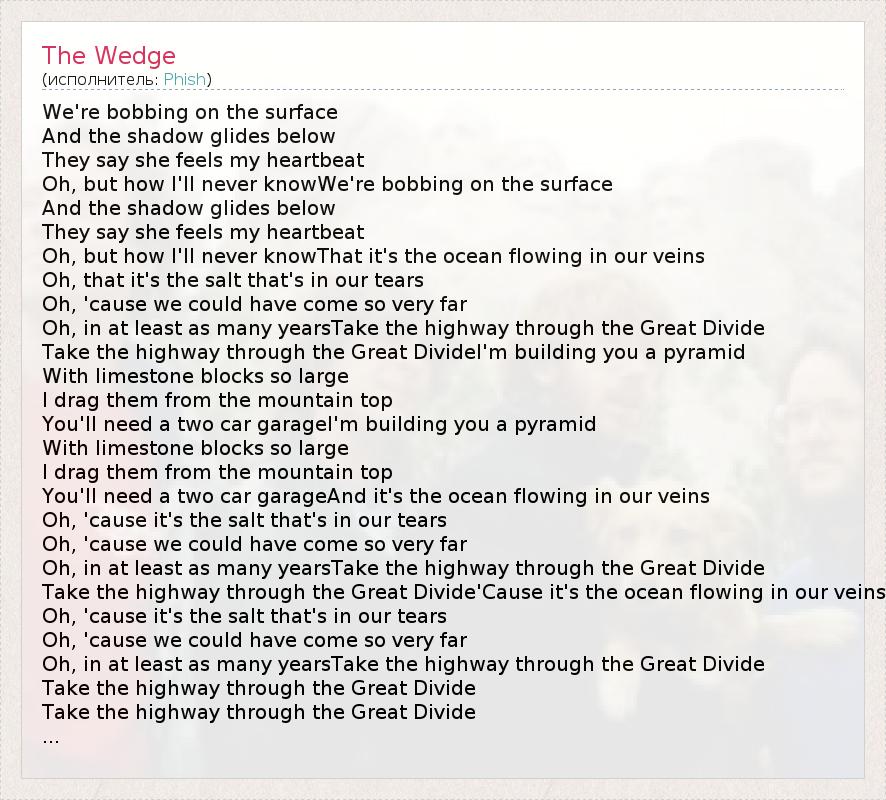 Это интересно:Phish — американская рок-группа, примечательная своими джем-сейшнами, импровизациями и постмодернистским смешением жанров. Phish была образована в 1983 году в университете Вермонта. Четыре ее участника выступали вместе 21 год, пока не распались в августе 2004 года. Их музыка содержала в себе элементы широкoго спектра жанров, и каждый их концерт был оригинальным в плане исполнения песен, порядка... продолжение