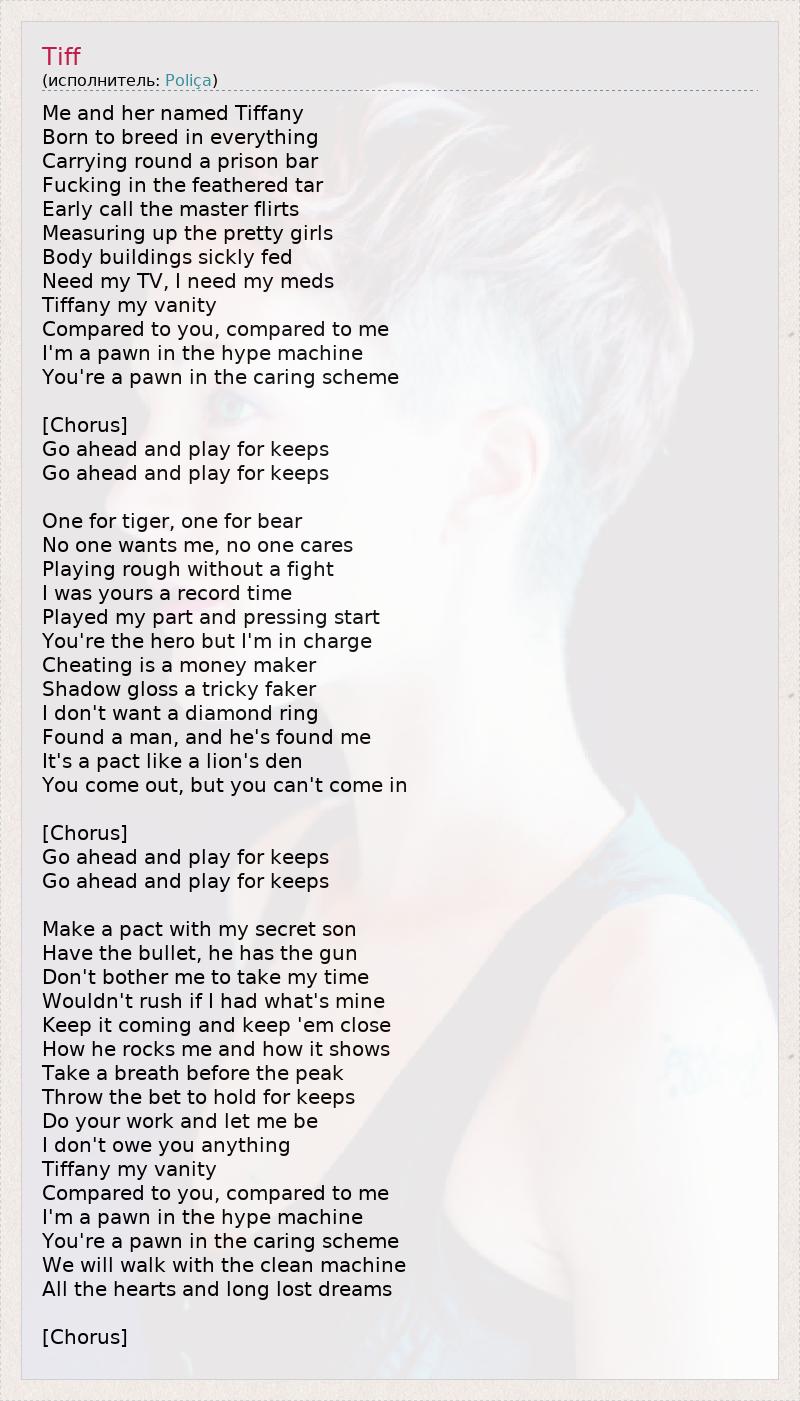 Me and her named Tiffany Born to breed in everything Carrying round a prison bar Fucking in the feathered tar Early call the master flirts Measuring up the pretty girls Body buildings sickly fed Need my TV, I need my meds Tiffany my vanity Compared to you, compared to me I'm a pawn in the hype machine You're a pawn in the caring scheme [Chorus] Go ahead and play for keeps Go ahead and play for keeps One for tiger, one for bear No one wants me, no one cares Playing rough without a fight I was yours a record time Played my part and pressing start You're the hero but I'm in charge Cheating is a money maker Shadow gloss a tricky faker I don't want a diamond ring Found a man, and he's found me It's a pact like a lion's den You come out, but you can't come in [Chorus] Go ahead and play for keeps Go ahead and play for keeps Make a pact with my secret son Have the bullet, he has the gun Don't bother me to take my time Wouldn't rush if I had what's mine Keep it coming and keep 'em close How he rocks me and how it shows Take a breath before the peak Throw the bet to hold for keeps Do your work and let me be I don't owe you anything Tiffany my vanity Compared to you, compared to me I'm a pawn in the hype machine You're a pawn in the caring scheme We will walk with the clean machine All the hearts and long lost dreams [Chorus]