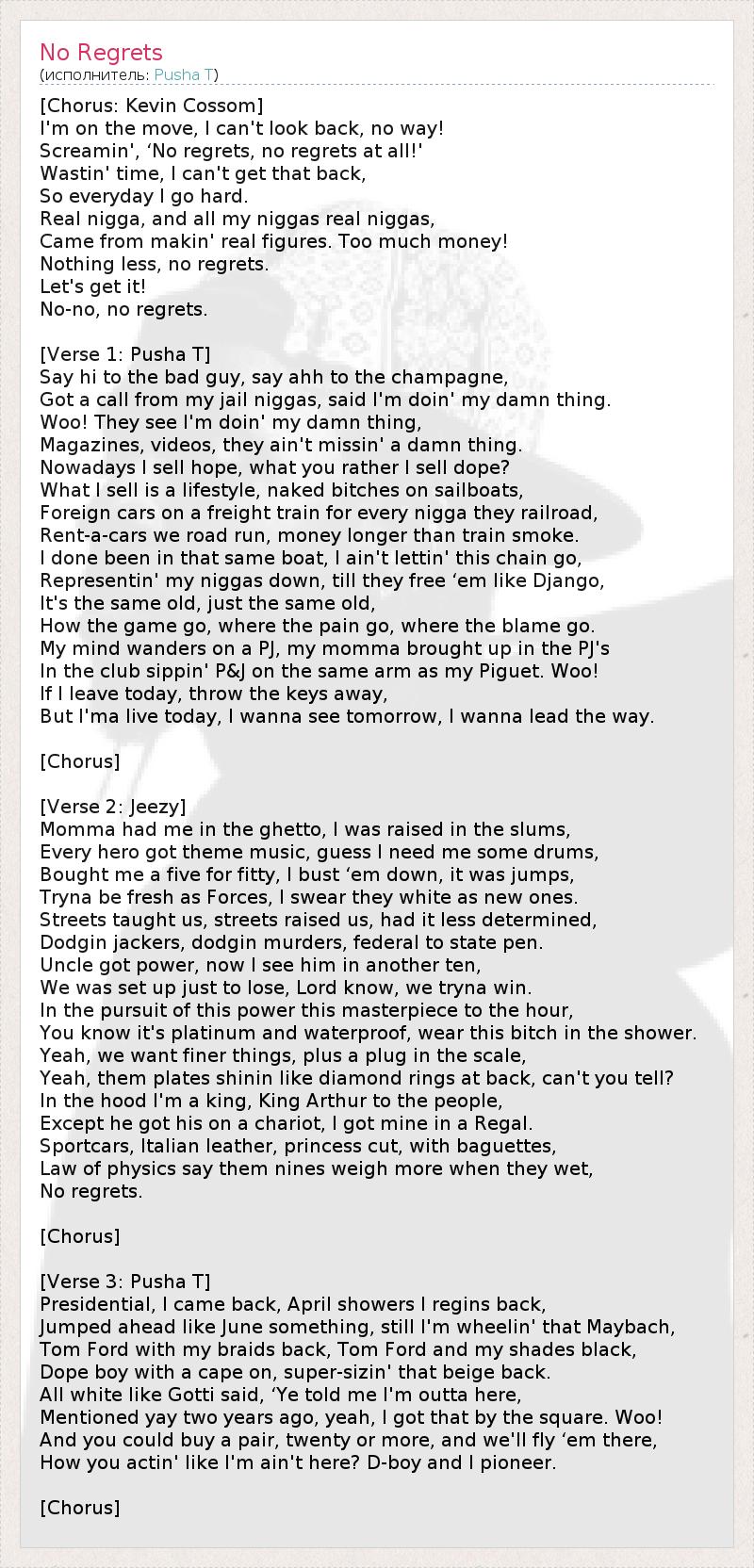 [Chorus: Kevin Cossom] I'm on the move, I can't look back, no way! Screamin', ‘No regrets, no regrets at all!' Wastin' time, I can't get that back, So everyday I go hard. Real nigga, and all my niggas real niggas, Came from makin' real figures. Too much money! Nothing less, no regrets. Let's get it! No-no, no regrets. [Verse 1: Pusha T] Say hi to the bad guy, say ahh to the champagne, Got a call from my jail niggas, said I'm doin' my damn thing. Woo! They see I'm doin' my damn thing, Magazines, videos, they ain't missin' a damn thing. Nowadays I sell hope, what you rather I sell dope? What I sell is a lifestyle, naked bitches on sailboats, Foreign cars on a freight train for every nigga they railroad, Rent-a-cars we road run, money longer than train smoke. I done been in that same boat, I ain't lettin' this chain go, Representin' my niggas down, till they free ‘em like Django, It's the same old, just the same old, How the game go, where the pain go, where the blame go. My mind wanders on a PJ, my momma brought up in the PJ's In the club sippin' P&J on the same arm as my Piguet. Woo! If I leave today, throw the keys away, But I'ma live today, I wanna see tomorrow, I wanna lead the way. [Chorus] [Verse 2: Jeezy] Momma had me in the ghetto, I was raised in the slums, Every hero got theme music, guess I need me some drums, Bought me a five for fitty, I bust ‘em down, it was jumps, Tryna be fresh as Forces, I swear they white as new ones. Streets taught us, streets raised us, had it less determined, Dodgin jackers, dodgin murders, federal to state pen. Uncle got power, now I see him in another ten, We was set up just to lose, Lord know, we tryna win. In the pursuit of this power this masterpiece to the hour, You know it's platinum and waterproof, wear this bitch in the shower. Yeah, we want finer things, plus a plug in the scale, Yeah, them plates shinin like diamond rings at back, can't you tell? In the hood I'm a king, King Arthur to the people, Except he got his on a chariot, I got mine in a Regal. Sportcars, Italian leather, princess cut, with baguettes, Law of physics say them nines weigh more when they wet, No regrets. [Chorus] [Verse 3: Pusha T] Presidential, I came back, April showers I regins back, Jumped ahead like June something, still I'm wheelin' that Maybach, Tom Ford with my braids back, Tom Ford and my shades black, Dope boy with a cape on, super-sizin' that beige back. All white like Gotti said, ‘Ye told me I'm outta here, Mentioned yay two years ago, yeah, I got that by the square. Woo! And you could buy a pair, twenty or more, and we'll fly ‘em there, How you actin' like I'm ain't here? D-boy and I pioneer. [Chorus]