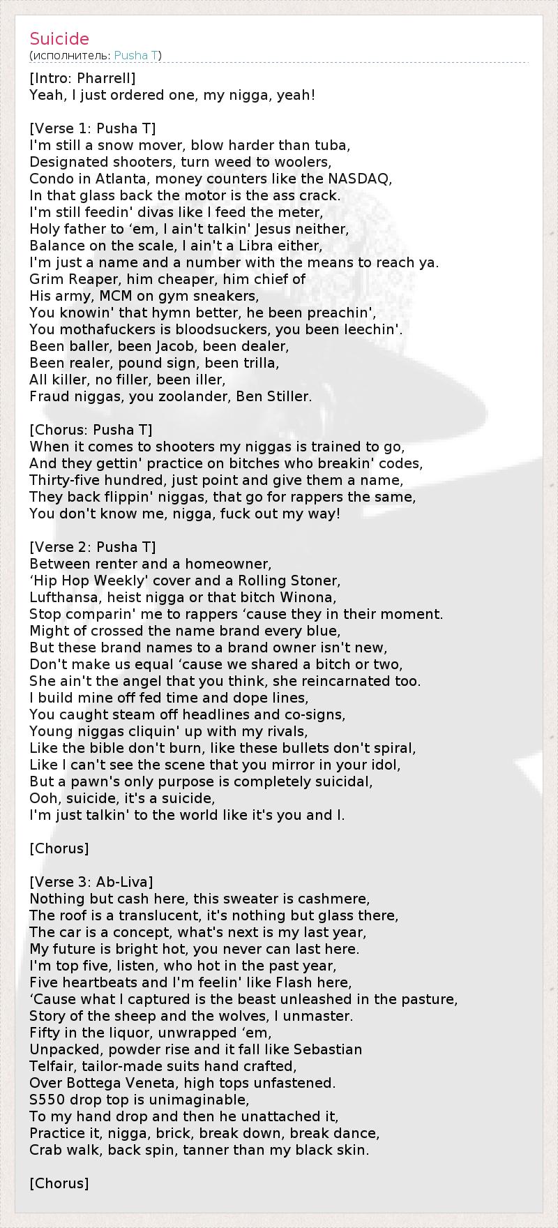 Это интересно:Pusha T (наст. имя Terrence Thornton) (родился 14 мая 1977) является основным рэппером Вирджиния-Бич и половиной хип-хоп дуэта Clipse. В сентябре 2010 года было объявлено о том, что он подписал контракт с лейблом Канье Уэста GOOD Music и 21 марта 2011 выпустил свой первый сольный микстейп, Fear of God.Родился в Бронксе, Нью-Йорк, но вскоре переехал в Норфолк, штат Вирджиния. В 1992 году Terrence и его брат Gene... продолжение