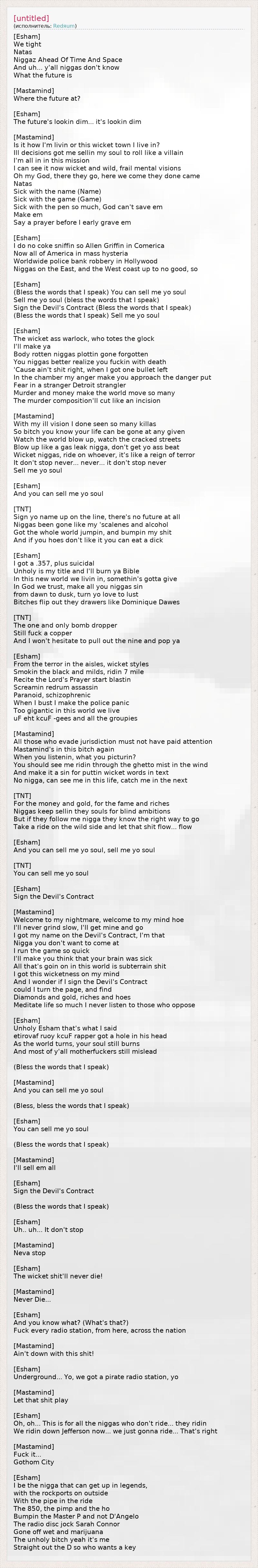 [Esham] We tight Natas Niggaz Ahead Of Time And Space And uh... y'all niggas don't know What the future is [Mastamind] Where the future at? [Esham] The future's lookin dim... it's lookin dim [Mastamind] Is it how I'm livin or this wicket town I live in? Ill decisions got me sellin my soul to roll like a villain I'm all in in this mission I can see it now wicket and wild, frail mental visions Oh my God, there they go, here we come they done came Natas Sick with the name (Name) Sick with the game (Game) Sick with the pen so much, God can't save em Make em Say a prayer before I early grave em [Esham] I do no coke sniffin so Allen Griffin in Comerica Now all of America in mass hysteria Worldwide police bank robbery in Hollywood Niggas on the East, and the West coast up to no good, so [Esham] (Bless the words that I speak) You can sell me yo soul Sell me yo soul (bless the words that I speak) Sign the Devil's Contract (Bless the words that I speak) (Bless the words that I speak) Sell me yo soul [Esham] The wicket ass warlock, who totes the glock I'll make ya Body rotten niggas plottin gone forgotten You niggas better realize you fuckin with death 'Cause ain't shit right, when I got one bullet left In the chamber my anger make you approach the danger put Fear in a stranger Detroit strangler Murder and money make the world move so many The murder composition'll cut like an incision [Mastamind] With my ill vision I done seen so many killas So bitch you know your life can be gone at any given Watch the world blow up, watch the cracked streets Blow up like a gas leak nigga, don't get yo ass beat Wicket niggas, ride on whoever, it's like a reign of terror It don't stop never... never... it don't stop never Sell me yo soul [Esham] And you can sell me yo soul [TNT] Sign yo name up on the line, there's no future at all Niggas been gone like my 'scalenes and alcohol Got the whole world jumpin, and bumpin my shit And if you hoes don't like it you can eat a dick [Esham] I got a .357, plus suicidal Unholy is my title and I'll burn ya Bible In this new world we livin in, somethin's gotta give In God we trust, make all you niggas sin from dawn to dusk, turn yo love to lust Bitches flip out they drawers like Dominique Dawes [TNT] The one and only bomb dropper Still fuck a copper And I won't hesitate to pull out the nine and pop ya [Esham] From the terror in the aisles, wicket styles Smokin the black and milds, ridin 7 mile Recite the Lord's Prayer start blastin Screamin redrum assassin Paranoid, schizophrenic When I bust I make the police panic Too gigantic in this world we live uF eht kcuF -gees and all the groupies [Mastamind] All those who evade jurisdiction must not have paid attention Mastamind's in this bitch again When you listenin, what you picturin? You should see me ridin through the ghetto mist in the wind And make it a sin for puttin wicket words in text No nigga, can see me in this life, catch me in the next [TNT] For the money and gold, for the fame and riches Niggas keep sellin they souls for blind ambitions But if they follow me nigga they know the right way to go Take a ride on the wild side and let that shit flow... flow [Esham] And you can sell me yo soul, sell me yo soul [TNT] You can sell me yo soul [Esham] Sign the Devil's Contract [Mastamind] Welcome to my nightmare, welcome to my mind hoe I'll never grind slow, I'll get mine and go I got my name on the Devil's Contract, I'm that Nigga you don't want to come at I run the game so quick I'll make you think that your brain was sick All that's goin on in this world is subterrain shit I got this wicketness on my mind And I wonder if I sign the Devil's Contract could I turn the page, and find Diamonds and gold, riches and hoes Meditate life so much I never listen to those who oppose [Esham] Unholy Esham that's what I said etirovaf ruoy kcuF rapper got a hole in his head As the world turns, your soul still burns And most of y'all motherfuckers still mislead (Bless the words that I speak) [Mastamind] And you can sell me yo soul (Bless, bless the words that I speak) [Esham] You can sell me yo soul (Bless the words that I speak) [Mastamind] I'll sell em all [Esham] Sign the Devil's Contract (Bless the words that I speak) [Esham] Uh.. uh... It don't stop [Mastamind] Neva stop [Esham] The wicket shit'll never die! [Mastamind] Never Die... [Esham] And you know what? (What's that?) Fuck every radio station, from here, across the nation [Mastamind] Ain't down with this shit! [Esham] Underground... Yo, we got a pirate radio station, yo [Mastamind] Let that shit play [Esham] Oh, oh... This is for all the niggas who don't ride... they ridin We ridin down Jefferson now... we just gonna ride... That's right [Mastamind] Fuck it... Gothom City [Esham] I be the nigga that can get up in legends, with the rockports on outside With the pipe in the ride The 850, the pimp and the ho Bumpin the Master P and not D'Angelo The radio disc jock Sarah Connor Gone off wet and marijuana The unholy bitch yeah it's me Straight out the D so who wants a key