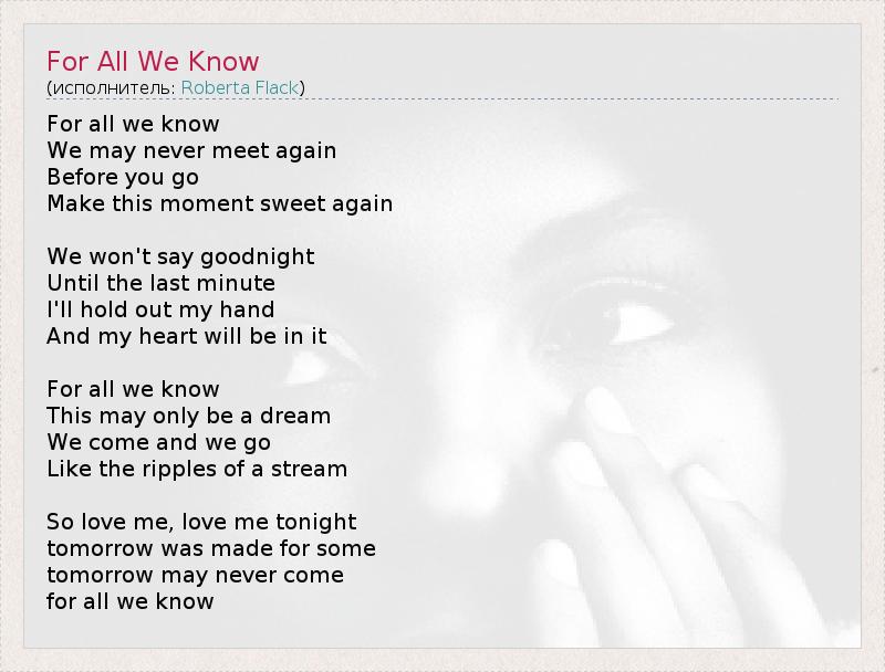 Это интересно:Роберта Флэк (англ. Roberta Flack, род. 10 февраля 1937 г.) — американская певица, автор песен. Неоднократная обладательница премии Грэмми. Известна исполнением утончённых джазовых баллад «The First Time Ever I Saw Your Face» (1972), «Killing Me Softly With His Song» (1973) и «Feel Like Makin' Love» (1974). Успех пришёл к Флэк в 1972 году, когда Клинт Иствуд использовал ее песню «The First Time Ever I Saw Your Face» в своем первом фильме «Сыграй мне «Туманно»».... продолжение