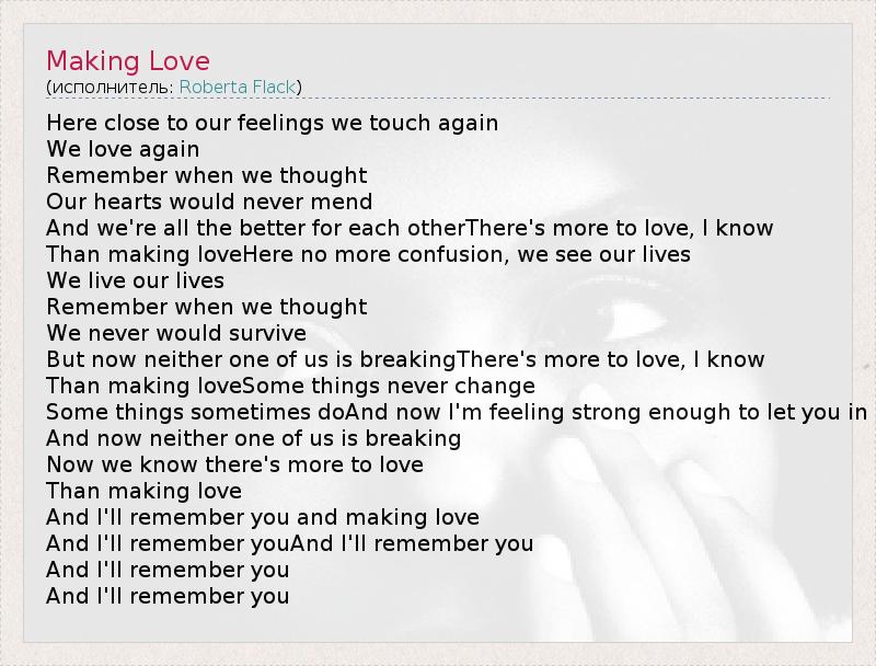 Это интересно:Роберта Флэк (англ. Roberta Flack, род. 10 февраля 1937 г.) — американская певица, автор песен. Неоднократная обладательница премии Грэмми. Известна исполнением утончённых джазовых баллад «The First Time Ever I Saw Your Face» (1972), «Killing Me Softly With His Song» (1973) и «Feel Like Makin' Love» (1974). Успех пришёл к Флэк в 1972 году, когда Клинт Иствуд использовал ее песню «The First Time Ever I Saw Your Face» в своем первом фильме «Сыграй мне «Туманно»».... продолжение