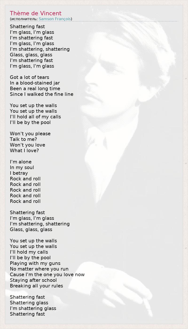 Shattering fast I'm glass, I'm glass I'm shattering fast I'm glass, I'm glass I'm shattering, shattering Glass, glass, glass I'm shattering fast I'm glass, I'm glass Got a lot of tears In a blood-stained jar Been a real long time Since I walked the fine line You set up the walls You set up the walls I'll hold all of my calls I'll be by the pool Won't you please Talk to me? Won't you love What I love? I'm alone In my soul I betray Rock and roll Rock and roll Rock and roll Rock and roll Rock and roll Shattering fast I'm glass, I'm glass I'm shattering, shattering Glass, glass, glass You set up the walls You set up the walls I'll hold my calls I'll be by the pool Playing with my guns No matter where you run Cause I'm the one you love now Staying after school Breaking all your rules Shattering fast Shattering glass I'm shattering glass Shattering fast