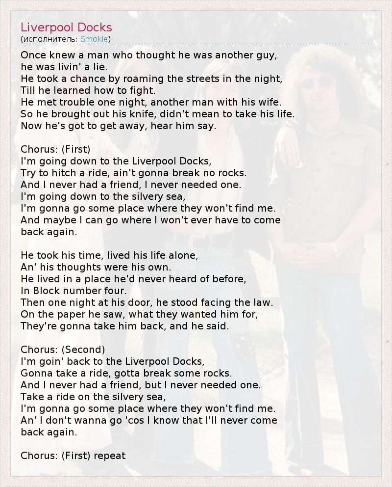 Once knew a man who thought he was another guy, he was livin' a lie. He took a chance by roaming the streets in the night, Till he learned how to fight. He met trouble one night, another man with his wife. So he brought out his knife, didn't mean to take his life. Now he's got to get away, hear him say. Chorus: (First) I'm going down to the Liverpool Docks, Try to hitch a ride, ain't gonna break no rocks. And I never had a friend, I never needed one. I'm going down to the silvery sea, I'm gonna go some place where they won't find me. And maybe I can go where I won't ever have to come back again. He took his time, lived his life alone, An' his thoughts were his own. He lived in a place he'd never heard of before, In Block number four. Then one night at his door, he stood facing the law. On the paper he saw, what they wanted him for, They're gonna take him back, and he said. Chorus: (Second) I'm goin' back to the Liverpool Docks, Gonna take a ride, gotta break some rocks. And I never had a friend, but I never needed one. Take a ride on the silvery sea, I'm gonna go some place where they won't find me. An' I don't wanna go 'cos I know that I'll never come back again. Chorus: (First) repeat