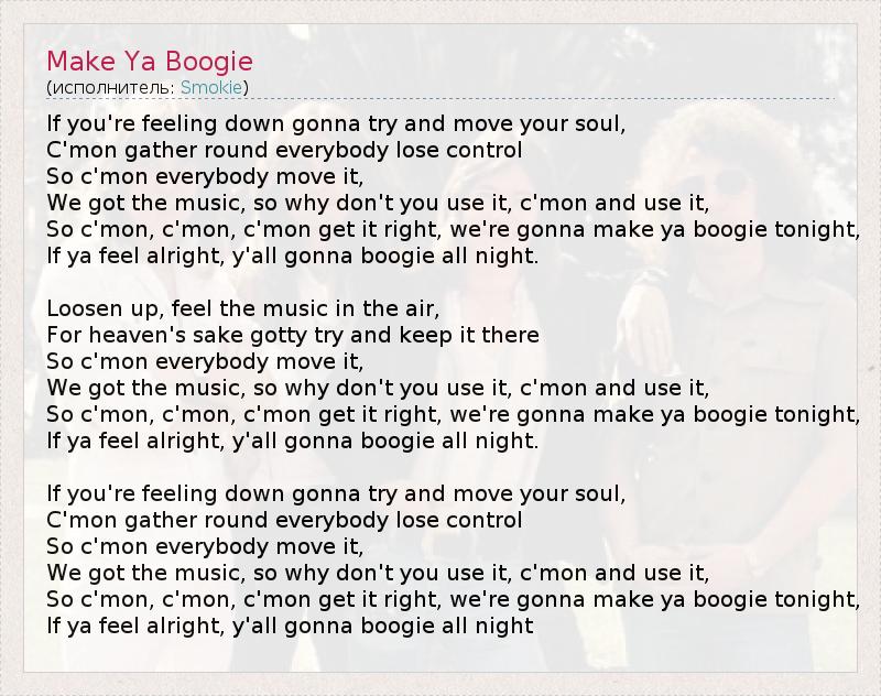 If you're feeling down gonna try and move your soul, C'mon gather round everybody lose control So c'mon everybody move it, We got the music, so why don't you use it, c'mon and use it, So c'mon, c'mon, c'mon get it right, we're gonna make ya boogie tonight, If ya feel alright, y'all gonna boogie all night. Loosen up, feel the music in the air, For heaven's sake gotty try and keep it there So c'mon everybody move it, We got the music, so why don't you use it, c'mon and use it, So c'mon, c'mon, c'mon get it right, we're gonna make ya boogie tonight, If ya feel alright, y'all gonna boogie all night. If you're feeling down gonna try and move your soul, C'mon gather round everybody lose control So c'mon everybody move it, We got the music, so why don't you use it, c'mon and use it, So c'mon, c'mon, c'mon get it right, we're gonna make ya boogie tonight, If ya feel alright, y'all gonna boogie all night