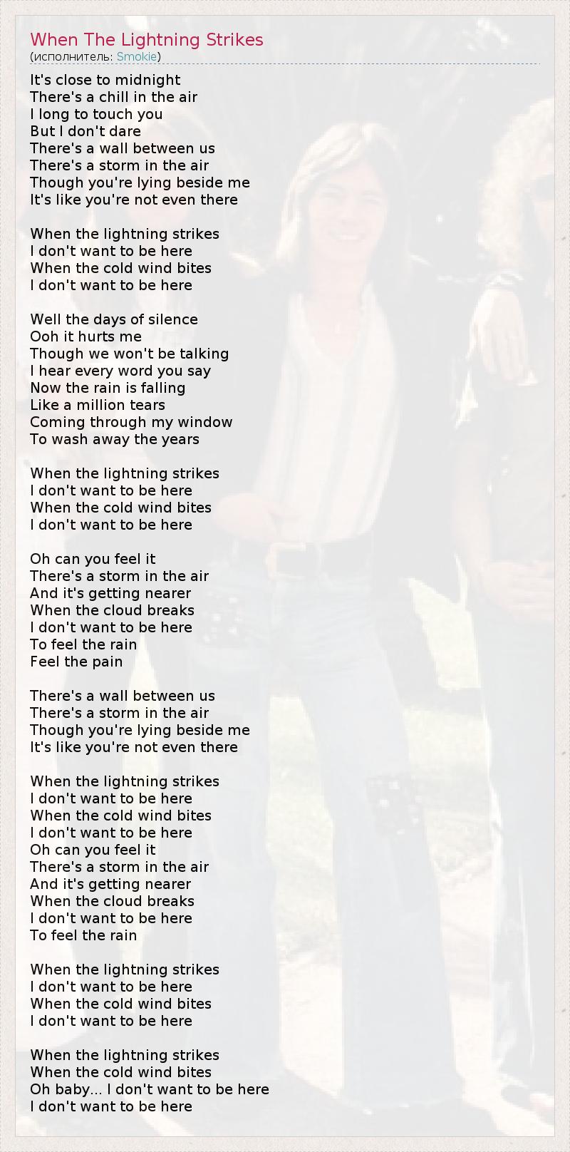 It's close to midnight There's a chill in the air I long to touch you But I don't dare There's a wall between us There's a storm in the air Though you're lying beside me It's like you're not even there When the lightning strikes I don't want to be here When the cold wind bites I don't want to be here Well the days of silence Ooh it hurts me Though we won't be talking I hear every word you say Now the rain is falling Like a million tears Coming through my window To wash away the years When the lightning strikes I don't want to be here When the cold wind bites I don't want to be here Oh can you feel it There's a storm in the air And it's getting nearer When the cloud breaks I don't want to be here To feel the rain Feel the pain There's a wall between us There's a storm in the air Though you're lying beside me It's like you're not even there When the lightning strikes I don't want to be here When the cold wind bites I don't want to be here Oh can you feel it There's a storm in the air And it's getting nearer When the cloud breaks I don't want to be here To feel the rain When the lightning strikes I don't want to be here When the cold wind bites I don't want to be here When the lightning strikes When the cold wind bites Oh baby... I don't want to be here I don't want to be here