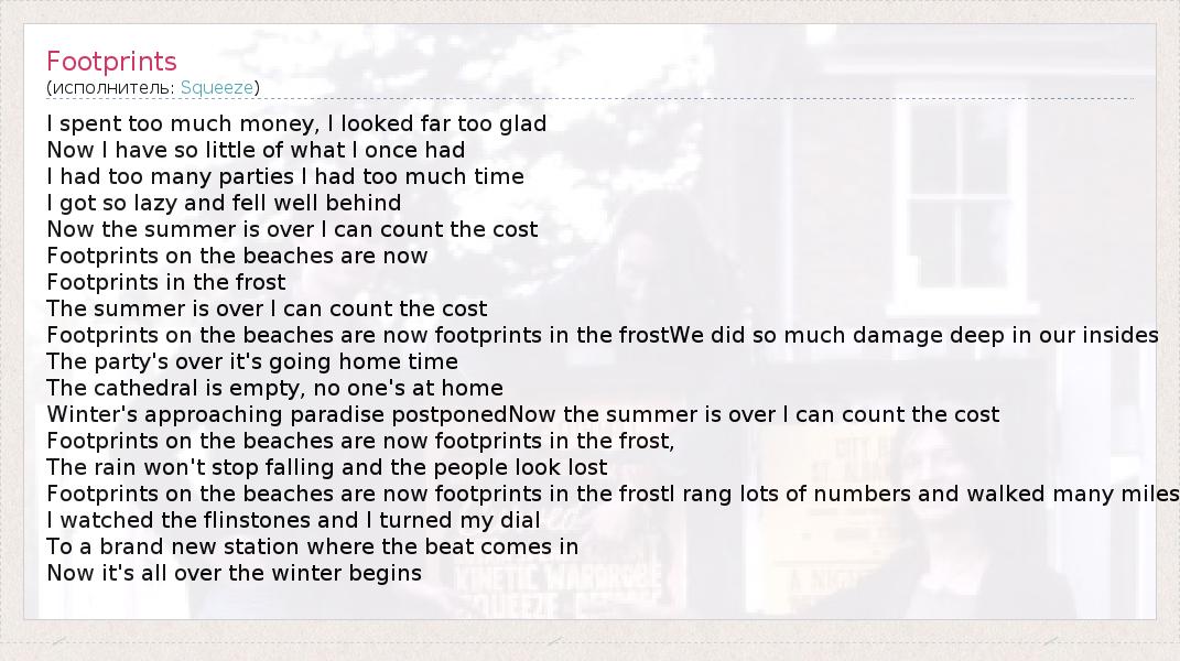 Это интересно:Squeeze — английская группа новой волны, в творчестве которой мотивы панк-, паб-, глэм- и арт-рока соеднились с классической поп-традицией 60-х годов. Крис Диффорд и Гленн Тилбрук (первый из них писал тексты, второй — музыку) никогда не скрывали того, что своими кумирами считают Леннона и Маккартни.История группы началась, когда Крис Диффорд (родился 11 апреля 1954 года) поместил на витрине... продолжение