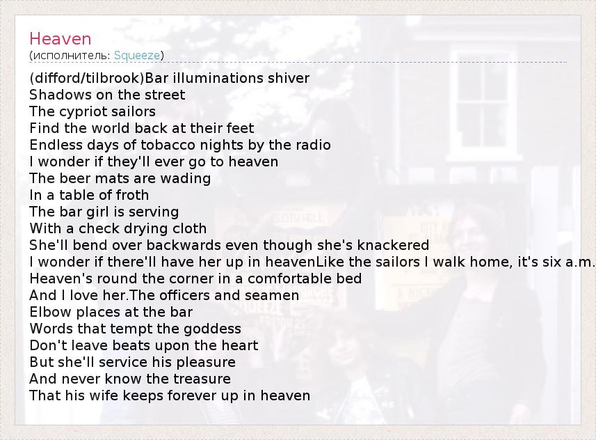 (difford/tilbrook)Bar illuminations shiver Shadows on the street The cypriot sailors Find the world back at their feet Endless days of tobacco nights by the radio I wonder if they'll ever go to heaven The beer mats are wading In a table of froth The bar girl is serving With a check drying cloth She'll bend over backwards even though she's knackered I wonder if there'll have her up in heavenLike the sailors I walk home, it's six a.m. Heaven's round the corner in a comfortable bed And I love her.The officers and seamen Elbow places at the bar Words that tempt the goddess Don't leave beats upon the heart But she'll service his pleasure And never know the treasure That his wife keeps forever up in heaven