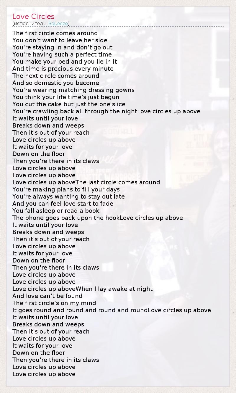 The first circle comes around You don't want to leave her side You're staying in and don't go out You're having such a perfect time You make your bed and you lie in it And time is precious every minute The next circle comes around And so domestic you become You're wearing matching dressing gowns You think your life time's just begun You cut the cake but just the one slice You're crawling back all through the nightLove circles up above It waits until your love Breaks down and weeps Then it's out of your reach Love circles up above It waits for your love Down on the floor Then you're there in its claws Love circles up above Love circles up above Love circles up aboveThe last circle comes around You're making plans to fill your days You're always wanting to stay out late And you can feel love start to fade You fall asleep or read a book The phone goes back upon the hookLove circles up above It waits until your love Breaks down and weeps Then it's out of your reach Love circles up above It waits for your love Down on the floor Then you're there in its claws Love circles up above Love circles up above Love circles up aboveWhen I lay awake at night And love can't be found The first circle's on my mind It goes round and round and round and roundLove circles up above It waits until your love Breaks down and weeps Then it's out of your reach Love circles up above It waits for your love Down on the floor Then you're there in its claws Love circles up above Love circles up above