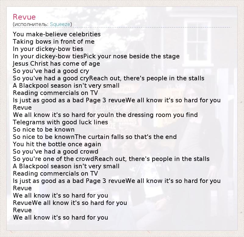 You make-believe celebrities Taking bows in front of me In your dickey-bow ties In your dickey-bow tiesPick your nose beside the stage Jesus Christ has come of age So you've had a good cry So you've had a good cryReach out, there's people in the stalls A Blackpool season isn't very small Reading commercials on TV Is just as good as a bad Page 3 revueWe all know it's so hard for you Revue We all know it's so hard for youIn the dressing room you find Telegrams with good luck lines So nice to be known So nice to be knownThe curtain falls so that's the end You hit the bottle once again So you've had a good crowd So you're one of the crowdReach out, there's people in the stalls A Blackpool season isn't very small Reading commercials on TV Is just as good as a bad Page 3 revueWe all know it's so hard for you Revue We all know it's so hard for you RevueWe all know it's so hard for you Revue We all know it's so hard for you
