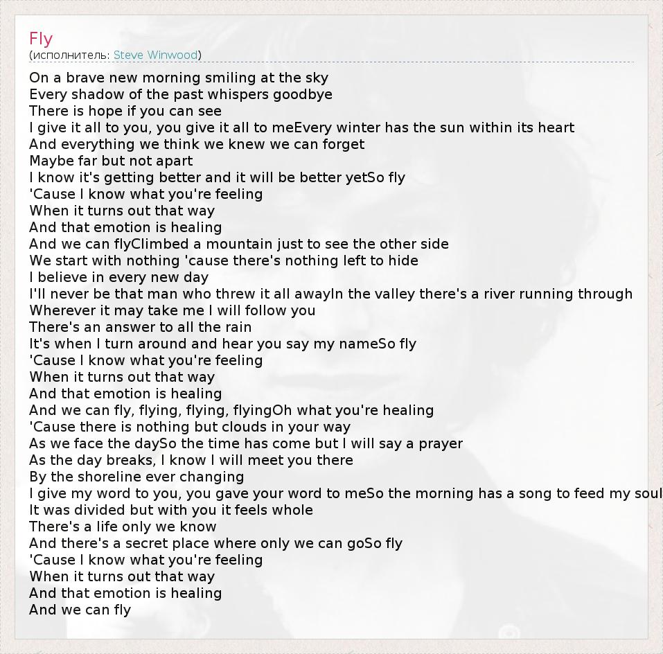 On a brave new morning smiling at the sky Every shadow of the past whispers goodbye There is hope if you can see I give it all to you, you give it all to meEvery winter has the sun within its heart And everything we think we knew we can forget Maybe far but not apart I know it's getting better and it will be better yetSo fly 'Cause I know what you're feeling When it turns out that way And that emotion is healing And we can flyClimbed a mountain just to see the other side We start with nothing 'cause there's nothing left to hide I believe in every new day I'll never be that man who threw it all awayIn the valley there's a river running through Wherever it may take me I will follow you There's an answer to all the rain It's when I turn around and hear you say my nameSo fly 'Cause I know what you're feeling When it turns out that way And that emotion is healing And we can fly, flying, flying, flyingOh what you're healing 'Cause there is nothing but clouds in your way As we face the daySo the time has come but I will say a prayer As the day breaks, I know I will meet you there By the shoreline ever changing I give my word to you, you gave your word to meSo the morning has a song to feed my soul It was divided but with you it feels whole There's a life only we know And there's a secret place where only we can goSo fly 'Cause I know what you're feeling When it turns out that way And that emotion is healing And we can fly
