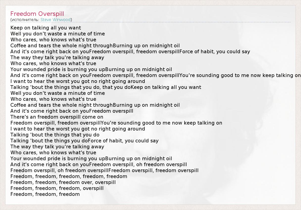 Keep on talking all you want Well you don't waste a minute of time Who cares, who knows what's true Coffee and tears the whole night throughBurning up on midnight oil And it's come right back on youFreedom overspill, freedom overspillForce of habit, you could say The way they talk you're talking away Who cares, who knows what's true Your wounded pride is burning you upBurning up on midnight oil And it's come right back on youFreedom overspill, freedom overspillYou're sounding good to me now keep talking on I want to hear the worst you got no right going around Talking 'bout the things that you do, that you doKeep on talking all you want Well you don't waste a minute of time Who cares, who knows what's true Coffee and tears the whole night throughBurning up on midnight oil And it's come right back on youFreedom overspill There's an freedom overspill come on Freedom overspill, freedom overspillYou're sounding good to me now keep talking on I want to hear the worst you got no right going around Talking 'bout the things that you do Talking 'bout the things you doForce of habit, you could say The way they talk you're talking away Who cares, who knows what's true Your wounded pride is burning you upBurning up on midnight oil And it's come right back on youFreedom overspill, oh freedom overspill Freedom overspill, oh freedom overspillFreedom overspill, freedom overspill Freedom, freedom, freedom, freedom, freedom Freedom, freedom, freedom over, overspill Freedom, freedom, freedom, overspill Freedom, freedom, freedom